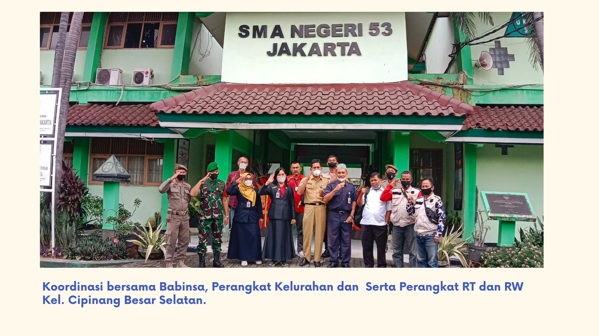 Selasa, 13 September 2022 SMA Negeri 53 Jakarta melaksanakan kegiatan koordinasi bersama dengan Babinsa atau Bhayangkara Pembina Keamanan dan Ketertiban Masyarakat (disingkat Bhabinkamtibmas), juga bersama Perangkat Kelurahan, Perangkat RT dan RW Kel. Cipinang Besar Selatan.