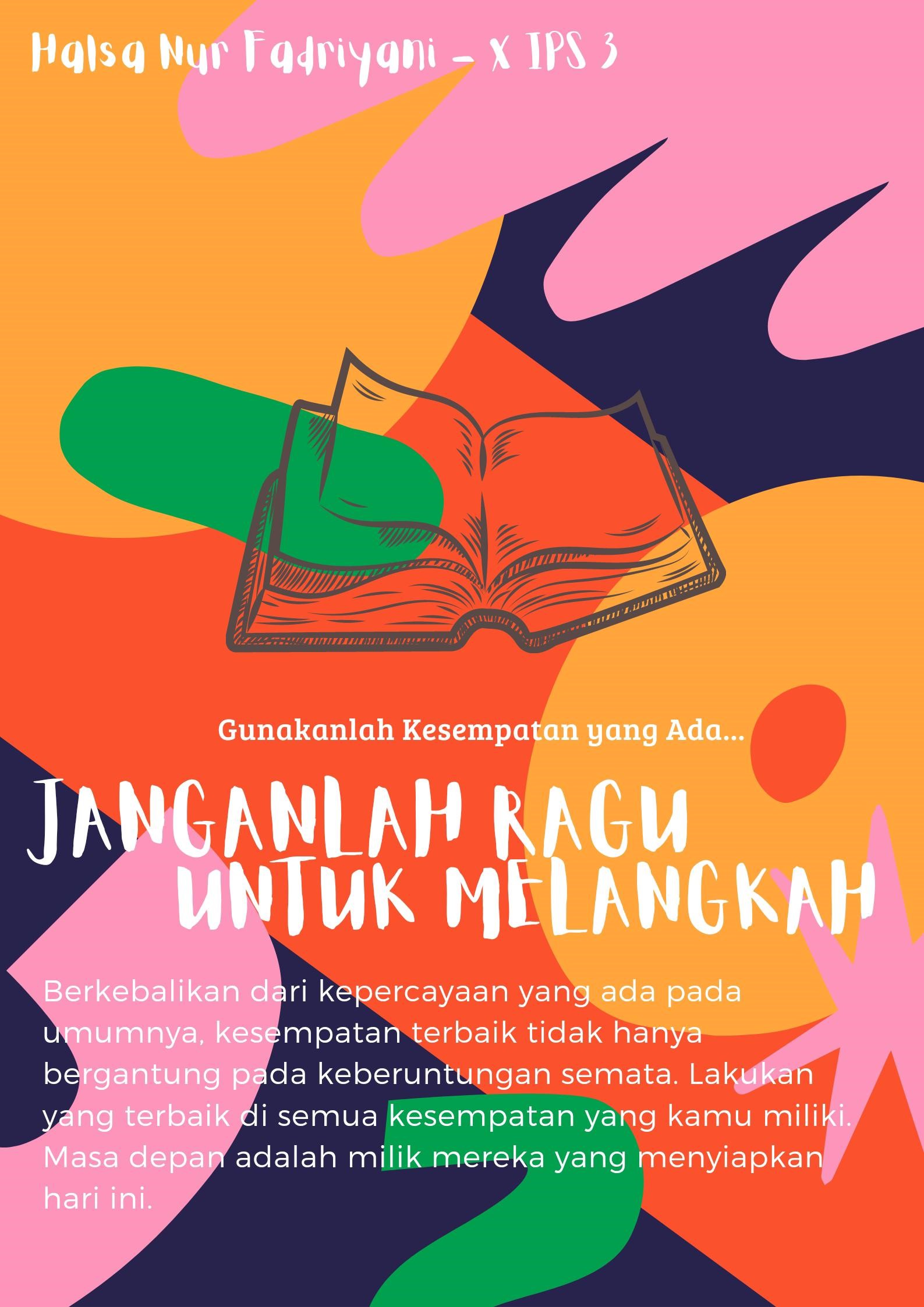 “Janganlah ragu untuk melangkah” sebuah kalimat yang memotivasi diri saya untuk semangat menjalani kehidupan. Terkadang dalam menjalani hidup, saya menemui persimpangan atau jalan buntu, maka dari itu saya membuat poster ini untuk mengajak teman-teman menggunakan kesempatan yang ada untuk meraih masa depan karena masa depan adalah milik mereka yang menyiapkan hari ini.