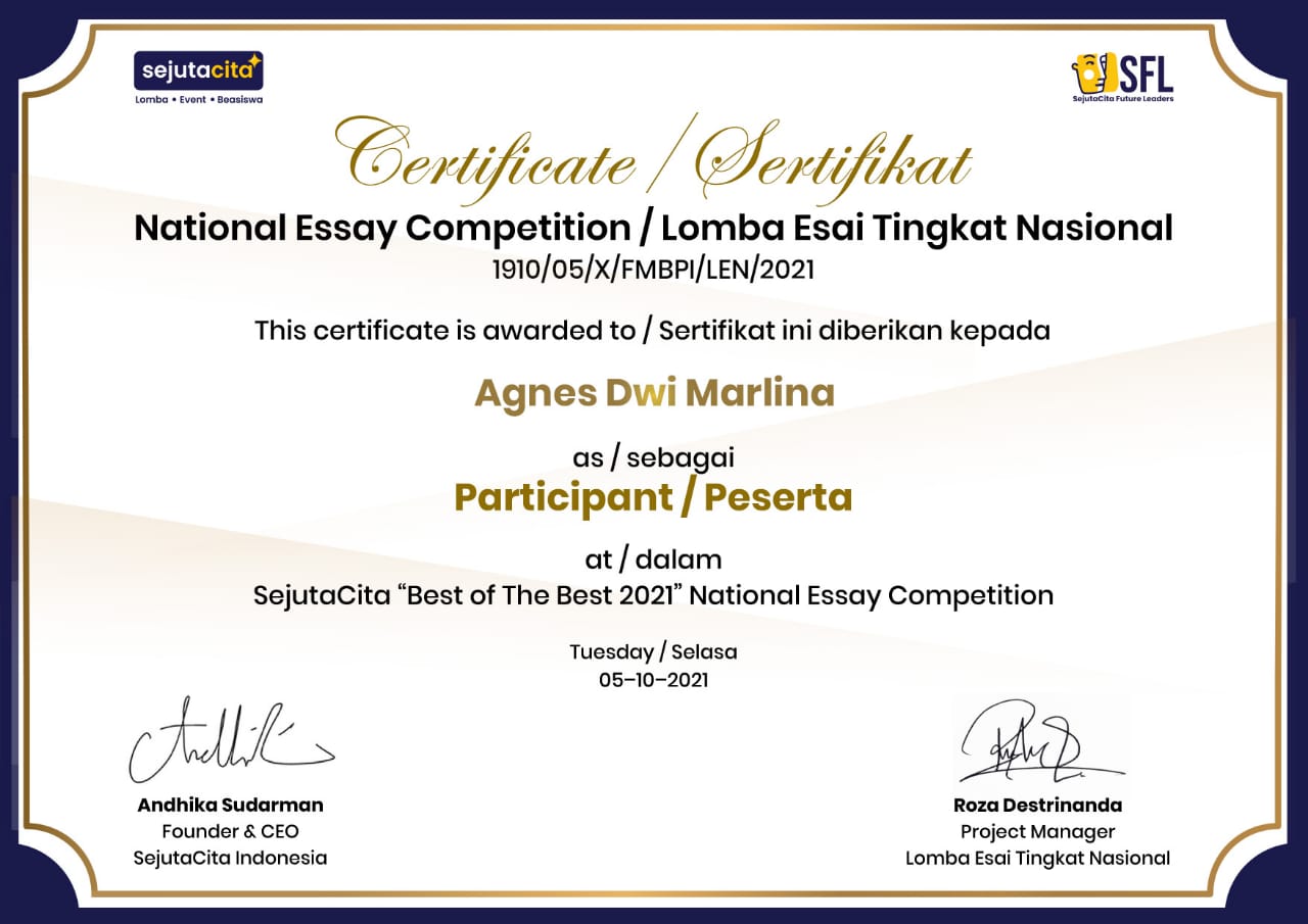 Saya mungkin bukan tipe seorang pelajar yang pintar sekali di sekolah. Tetapi karena usaha perjuangan saya untuk meraih mimpi, selama dua tahun berturut-turut saya selalu mendapatkan peringkat pertama di kelas. Saya anggap itu juga karena Allah dan orang tua yang meridai perjuangan saya selama proses belajar. Ya, walaupun hanya sekadar berjuang untuk rajin belajar dan mengumpulkan tugas. Tetapi, itu namanya perjuangan, kan?